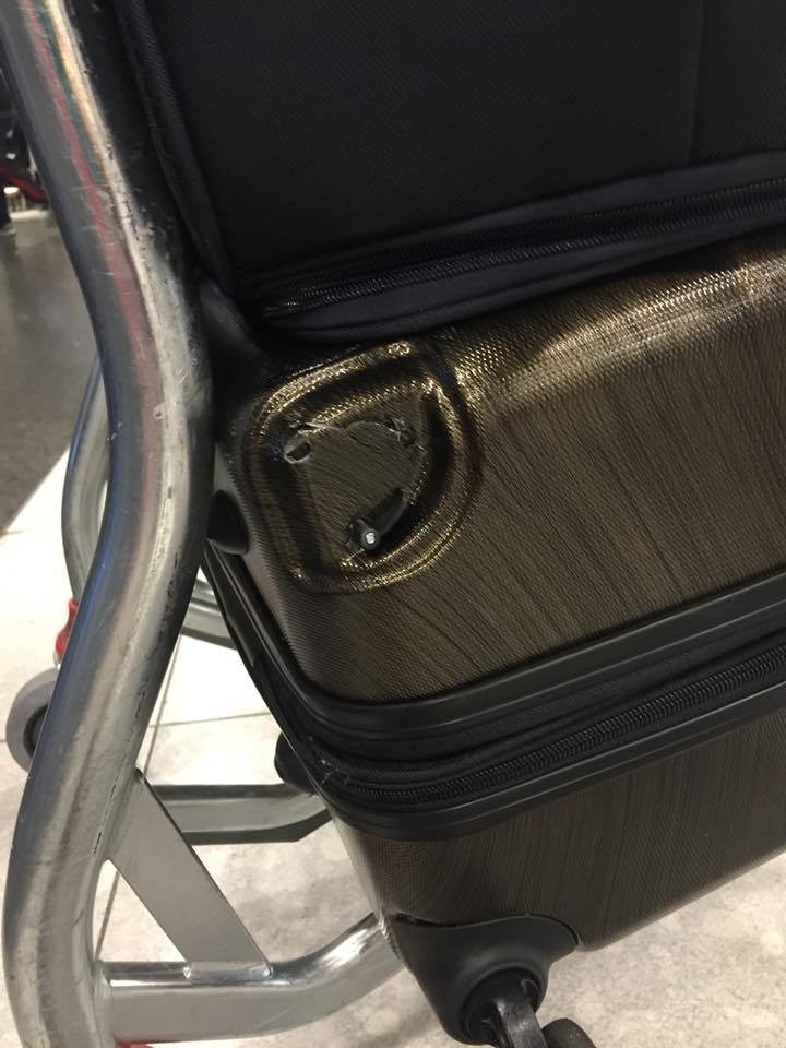 航空会社の積荷で大型スーツケースの足がもぎ取られていた。新しく買って良い値段だったんだけどなあ!