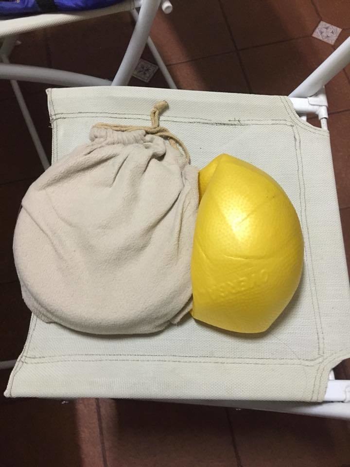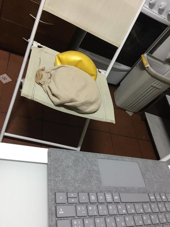 椅子の上には湯たんぽと飛行機の椅子に背もたれに使おうとして持ってきた小さめのバランスボールを置いてお尻を温める。