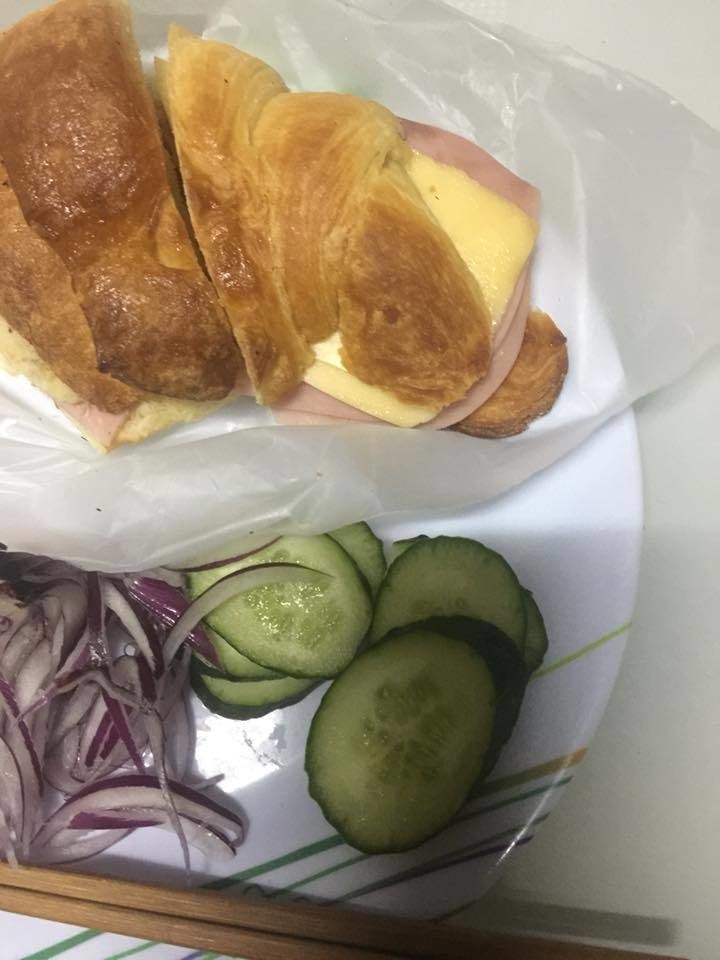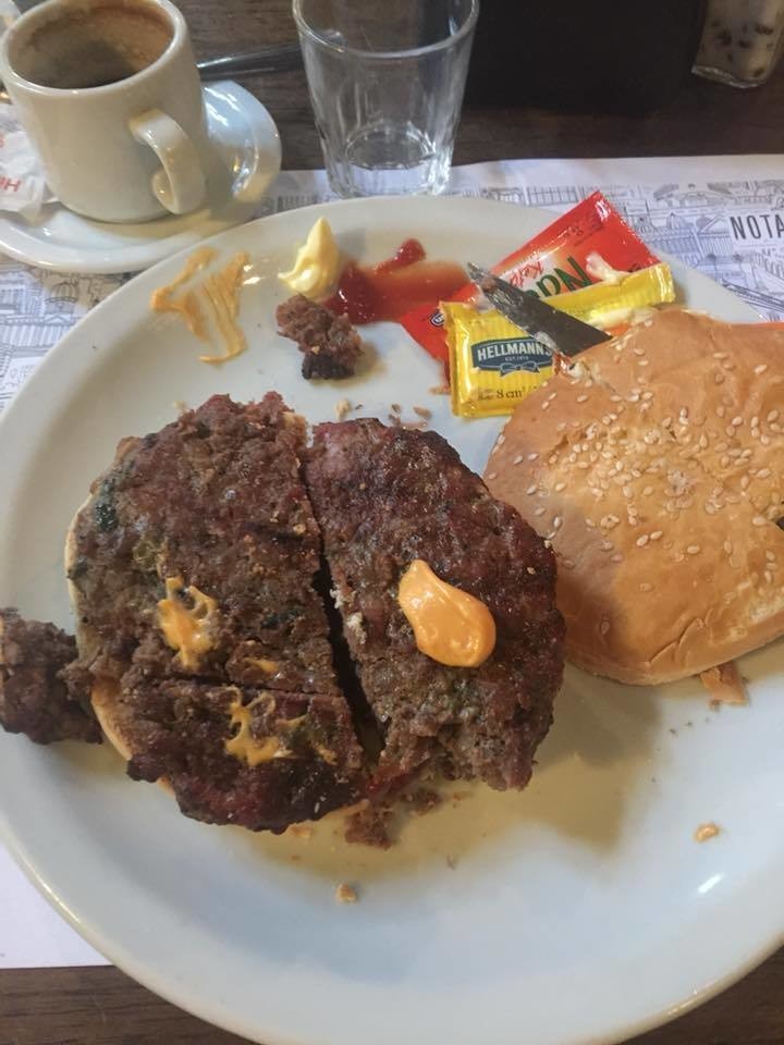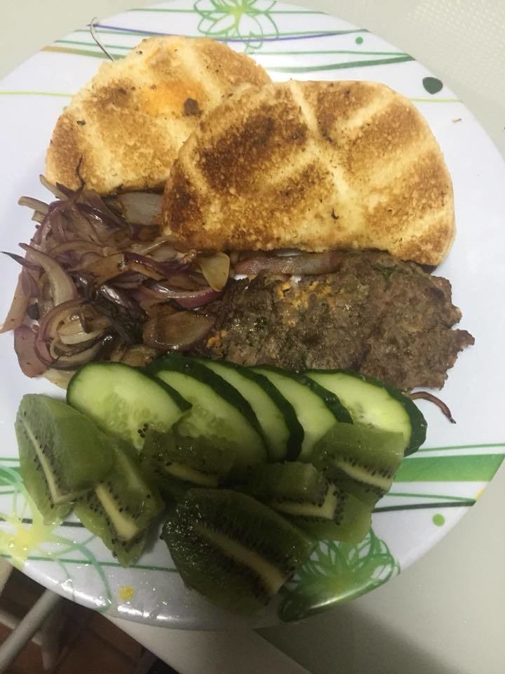 味が濃く半分しか食べれず、夕食用に包んでもらう。夕食は持ち帰った半分のハンバーガーと紫玉ねぎをオリーブオイルソースで焼いて胡瓜とキューイを添えて食べたら程よい味になった。