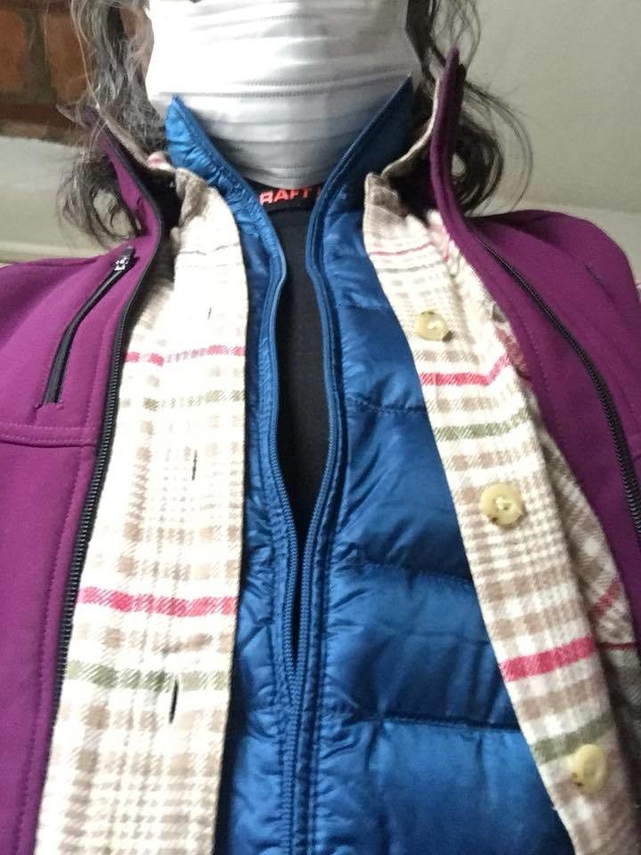 外を歩いているときは体を動かしているので着れば寒さは大丈夫ですが、家の中ではマスクをして、絹の下着・ウールのシャツ・ダウンジャケット・登山用ウールシャツ・袖なしの冬自転車で走るとき寒さに耐えられるジャケットと着るわ着るわ、5枚着ている。が凍えそうに寒い。
